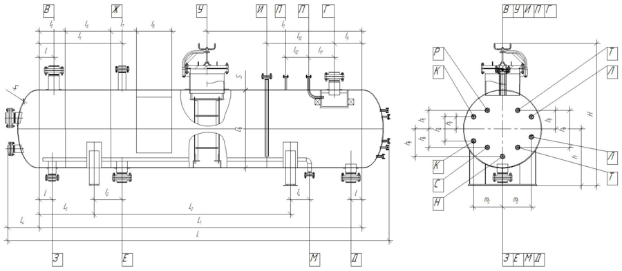 Обозначение Назначение Размеры в зависимости от объёма аппарата А Для входа нефтегазовой смеси 200–600 Б Вход газа 150–500 В Выход газа 200–600 Г Для выхода нефти 200–600 Д Для очистки 150–500 Е Для предохранительного клапана 200–600 Ж Для дренажа 200–600 З Для датчика уровня 150–500 И Для регулятора уровня 65 К Для сигнализатора уровня 50 Л Для пропарки 50 М Для термометра ртутного 50 Н Для дифманометра 50 П Для манометра М20х1,5 Р Для термометра сопротивления по запросу С Для указателя уровня 20–50 Т Люк-лаз 600 -